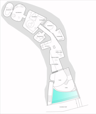 Carved into the volcanic soil as per the timeless style of Santorini’s traditional architecture, it opens up to the sudden drop of the Caldera, a unique sense of hovering in the air while relaxing in the crescent shaped pool, bathing in the soothing sunlight.